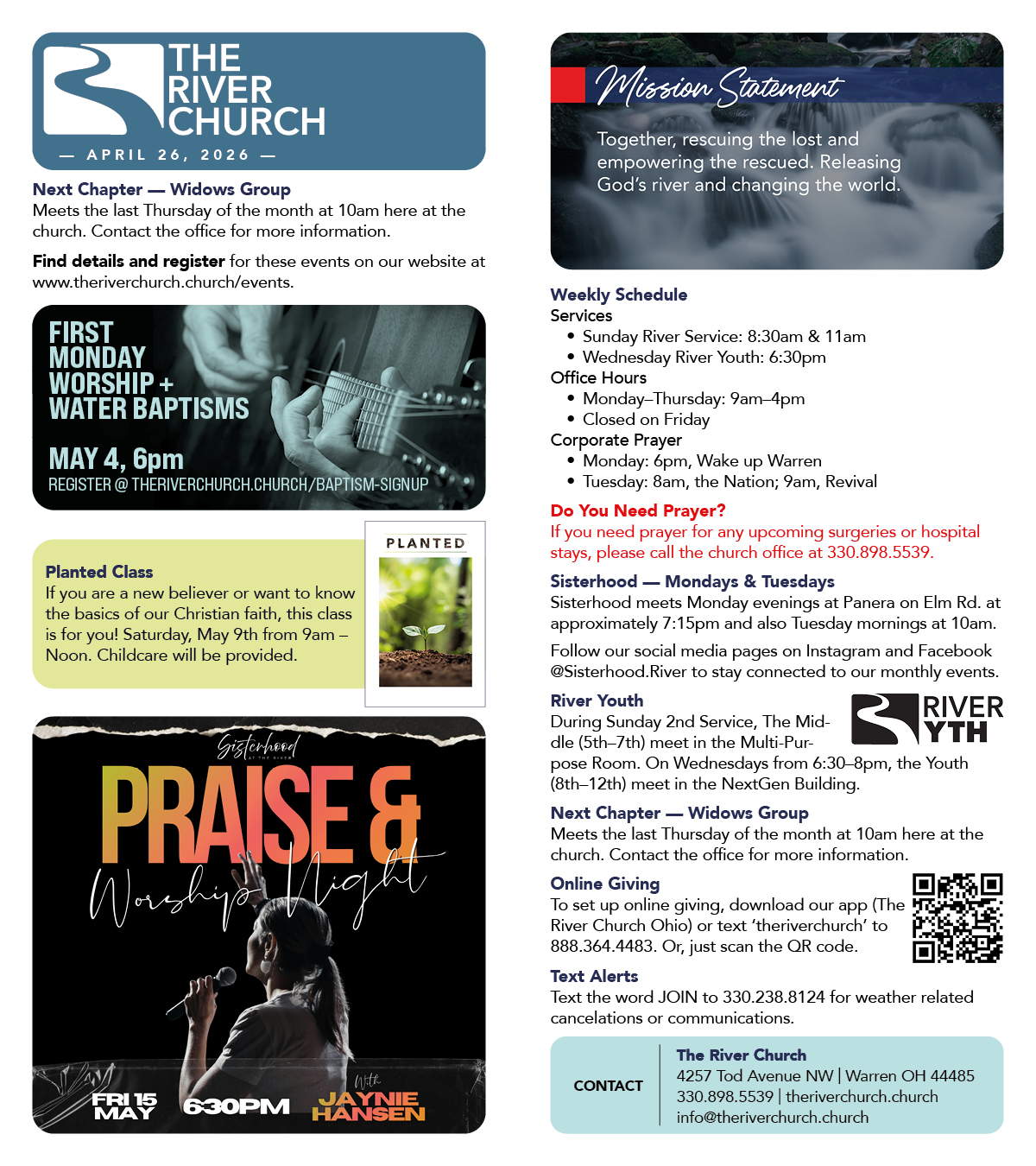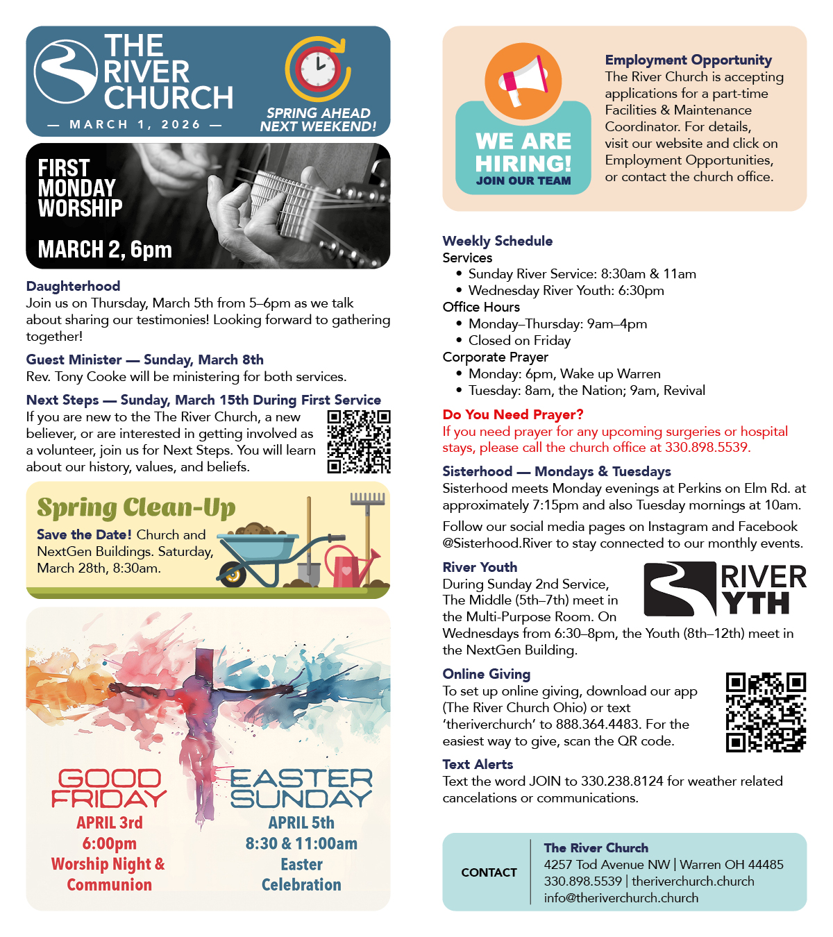 The River Church is a place where people can meet Jesus, engage in life-giving community, and everyone is welcome. We believe in creating a space where people can have authentic encounters with Christ, discover their gifts and use them for God's glory. Join us for our Sunday services!